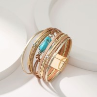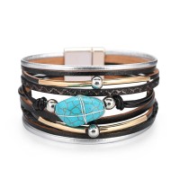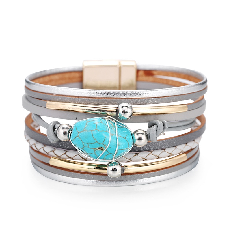 Bohemian Multilayer Wrap Leather Bracelets Metal Tube Natural Blue Stone Beads Charm Bracelet with Magnet Clasp Jewelry