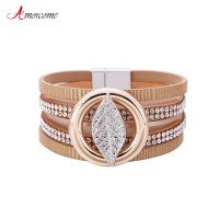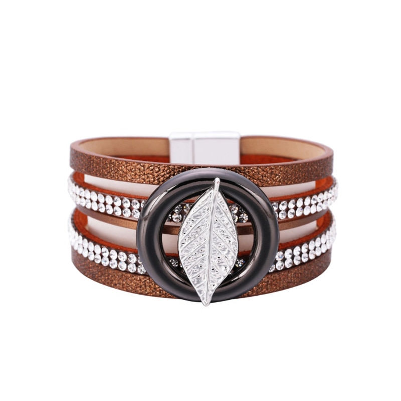 Boho Rhinestone Leaf Charm Leather Wrap Bracelet for Women Metal Circle Cuff Bangle Bracelets Jewelry Bijoux Femme