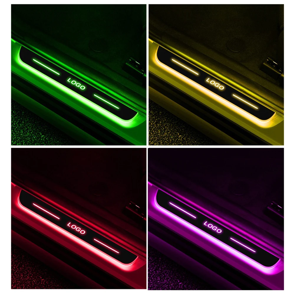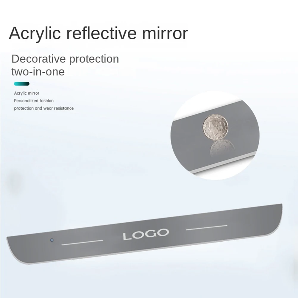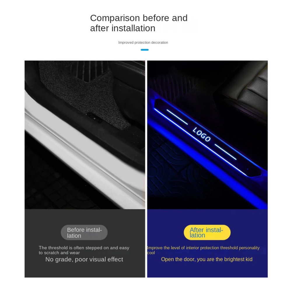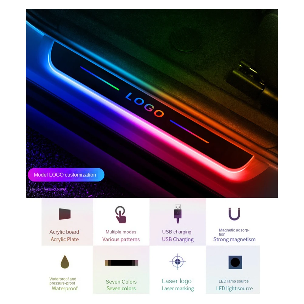 Car Door Illuminated Sill Light Universal LED Door Sill Scuff Streamer Light Waterproof Auto Accessories for Benz for Volkswagen Feature: 1. Applicable Car Brand: The car door illuminated sill light is suitable for BMW, for Mercedes, for Toyota, for Honda, for Volkswagen, for Chevrolet, for Tesla, and for Nissan. 2. High Quality: High grade gray mirror surface, upgraded sticky super good sticker, easy to take and place, does not drop, upgraded waterproof button, the original car texture. 3. Three Modes: Streamer mode, breath light mode, and colorful mode. RGB multi-color footlights, 7 colors (white, red, blue, green, yellow, purple, ice blue). 4. Easy Installation: Direct installation without wiring. Anti scratch and anti rub. 5. Satisfaction Guarantee: We strive to provide each customer with the highest standard of customer service to ensure you have a pleasant shopping experience. If you have any issues, inquiries or need assistance, please feel free to contact us directly.