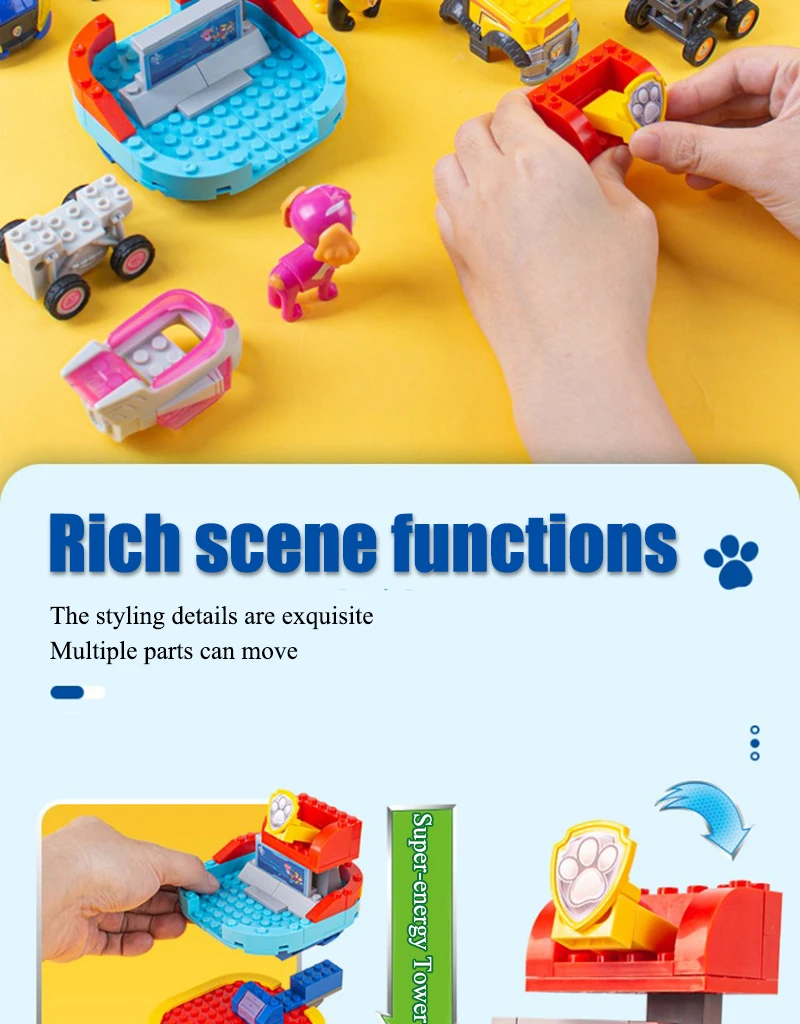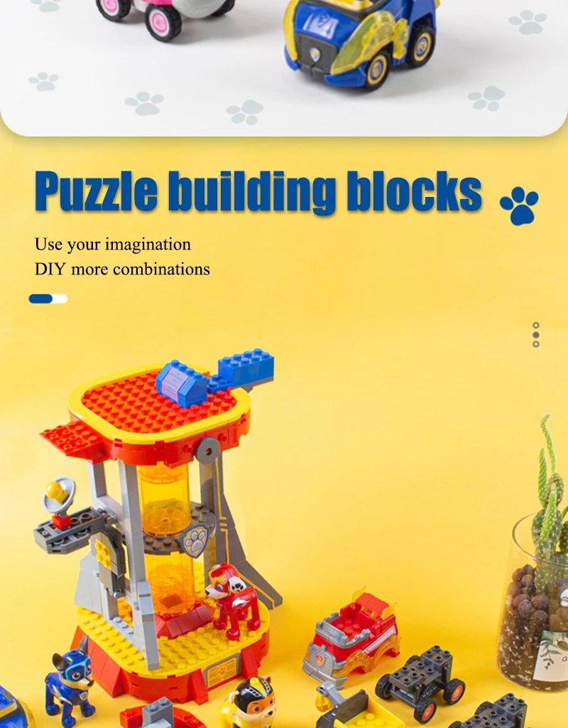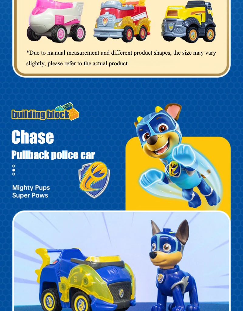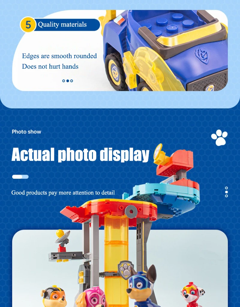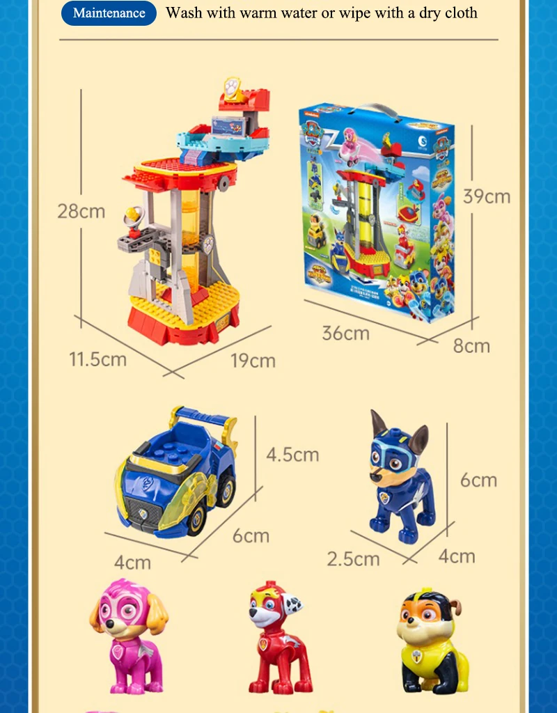 Product Name: Paw Patrol Building block toys Material: ABS / PVC Applicable age: children over 6 years old Product size: see details page Maintenance: wash with warm water or wipe with dry cloth Warm tip: due to manual measurement and different product shapes, the size may be slightly different. Please refer to the real object.