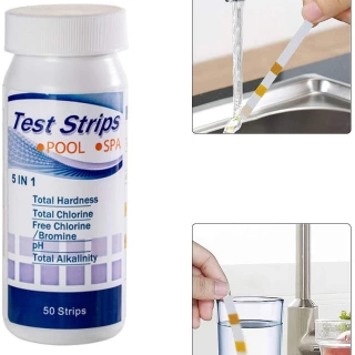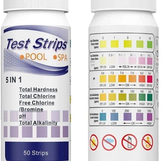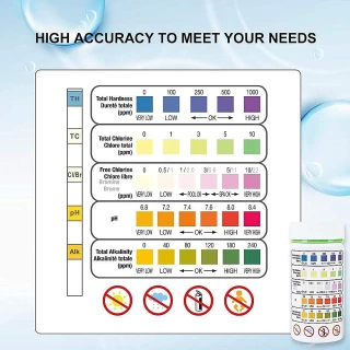 Test strips with 5 in 1 design are widely used for testing water quality in swimming pool, hot tub, spa, aquarium and so on. Measuring strips with precision design are easy to use and can be tested at the same time and test total chlorine, free chlorine, pH, total hardness and total alkalinity.