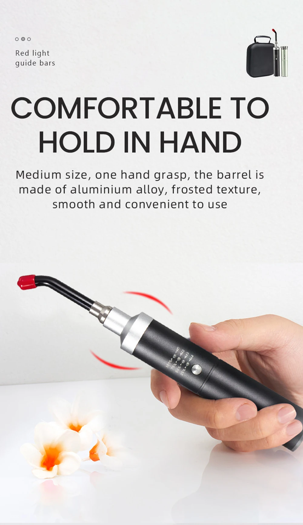 ● Hold the device over the sore area at a distance of 1cm away from the skin. Keep the light on the treatment area for one minute. Do not move or wave the device across the treatment area. ●At a 1-cm distance the diameter of the light beam is around 1.5cm. If the treatment area is larger than the beam size, please separate the treatment zone into parts, and finish them one by one. ● If you feel any discomfort triggered by the use of the device, increase the distance of the device from your skin or stop treatment immediately. **When red light irradiated canker sores, the mean healing time decreased from 8.9 days to 3.1 days. A questionnaire survey showed that 90% of mouth ulcer patients believed that red light therapy could immediately help them relieve their pain
