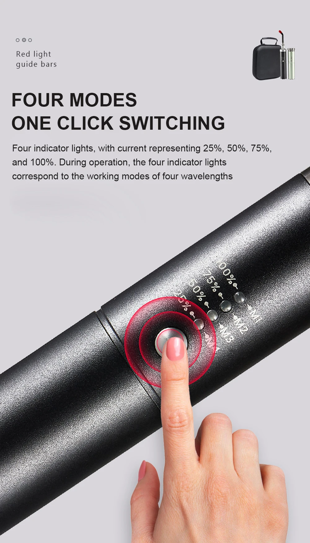 Press again: (Red 630+660nm) 10Hz pulse flash; The above two modes light up the second indicator light;